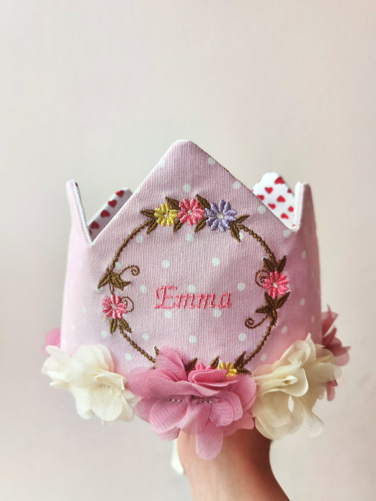 Corona Rosa Puntos Blancos y Flores multicolor