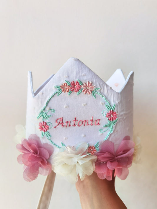 Corona Blanca flores rosadas