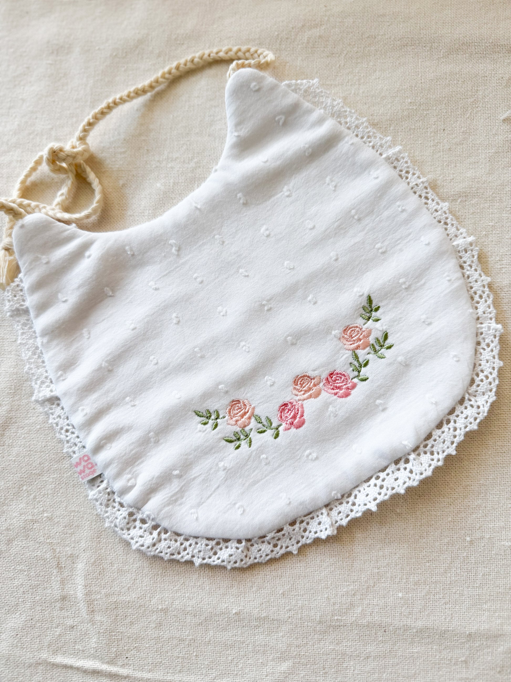 Confeccionado en tela de algodon, bordado, este babero combina delicadeza y funcionalidad en una pieza única.